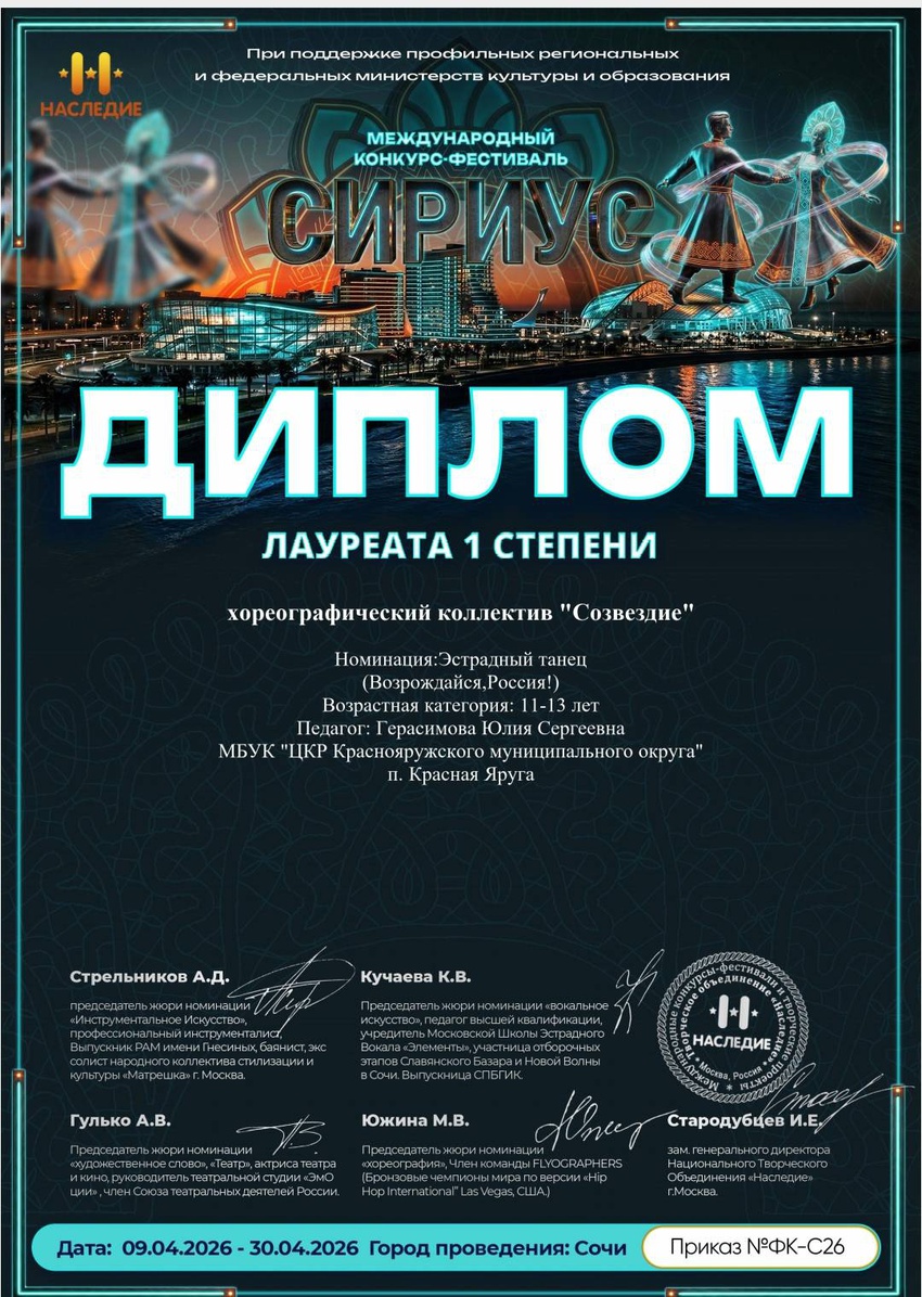 Хореографический коллектив «Созвездие» стал лауреатом I степени международного конкурса-фестиваля «Сириус»!