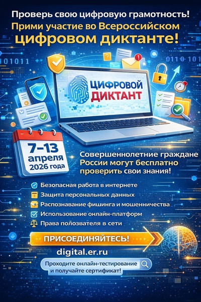 С 7 по 13 апреля 2026 года проходит масштабная всероссийская проверка цифровой грамотности населения — Цифровой диктант. Проект реализуется в рамках программы «Цифровая Россия» партии «Единая Россия».