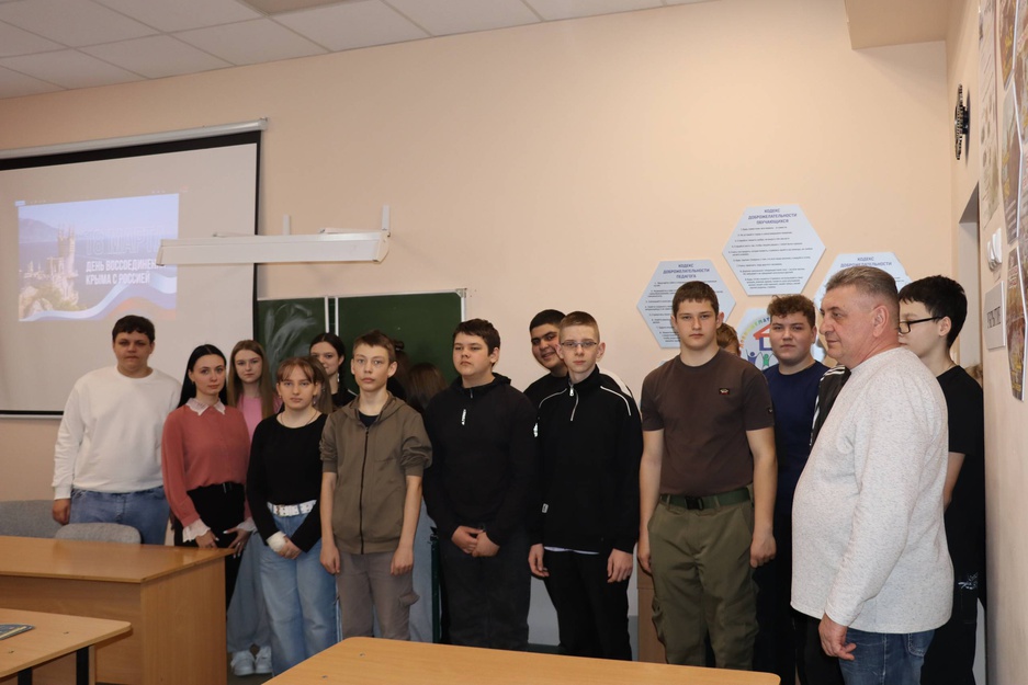 На уроке ребята познакомились с событиями, произошедшими 18 марта 2014 года, когда после проведённого референдума был подписан исторический договор о присоединении Крыма и Севастополя к России. Этот день стал символом единства народа и торжества исторической справедливости.