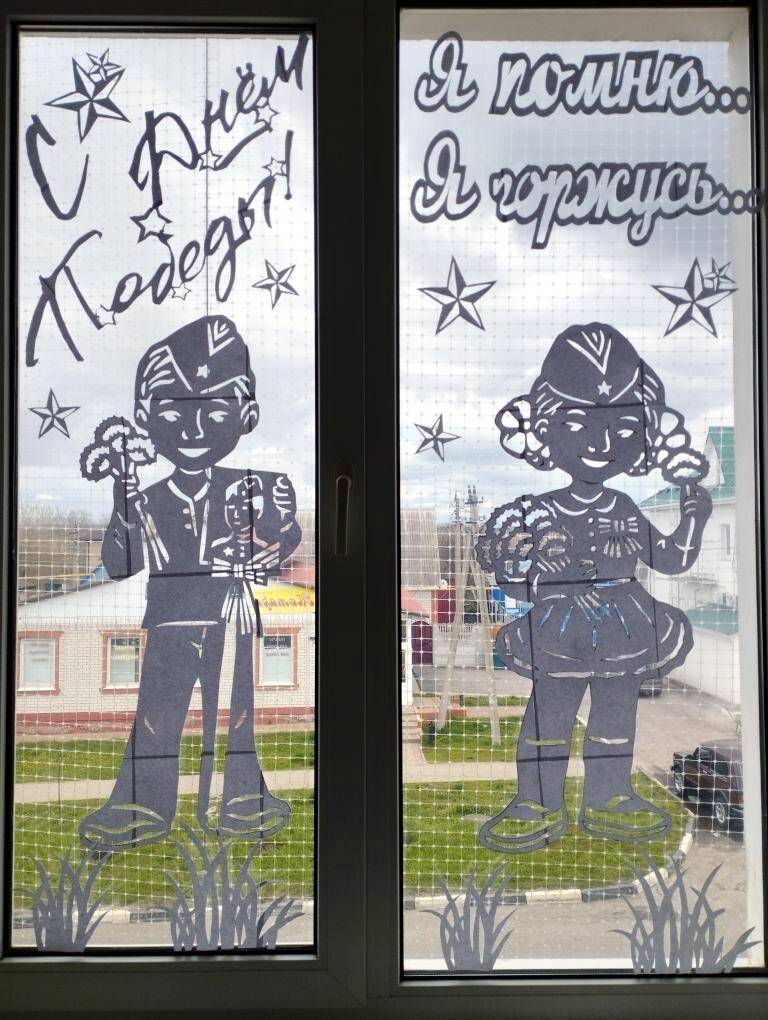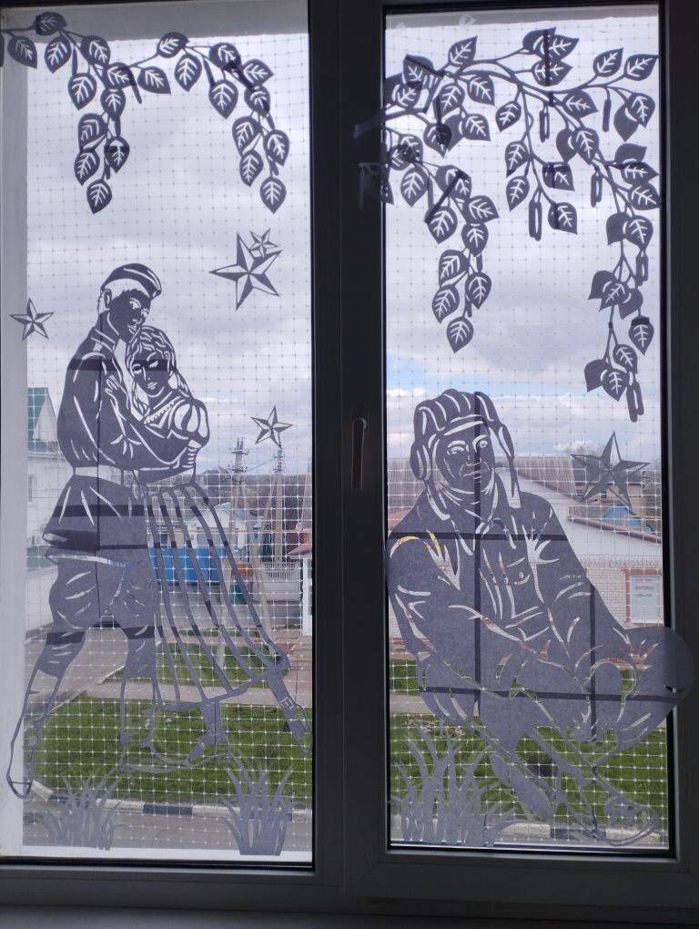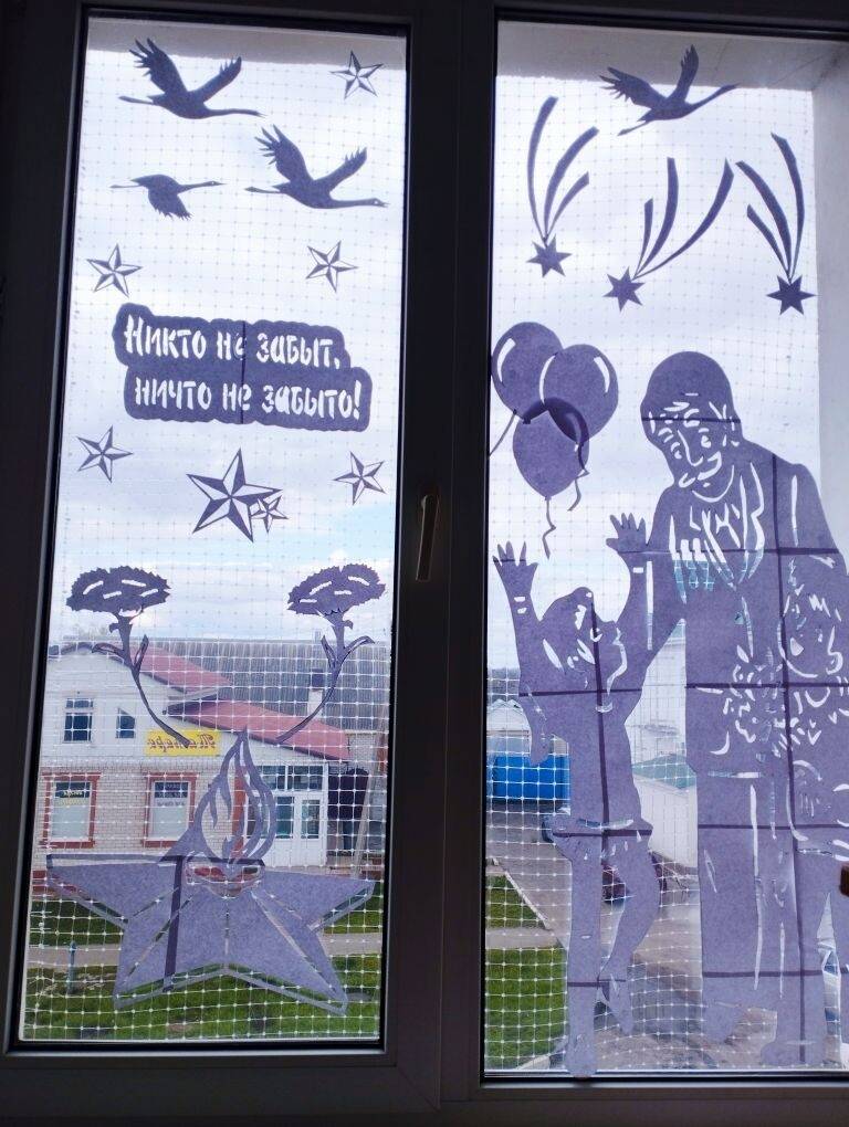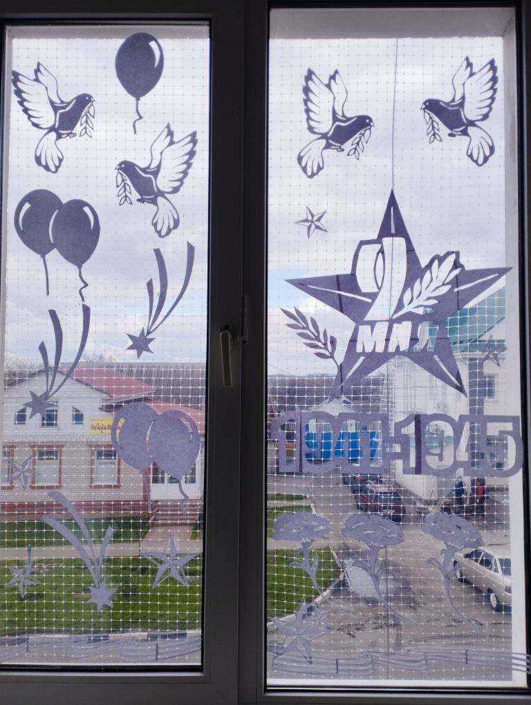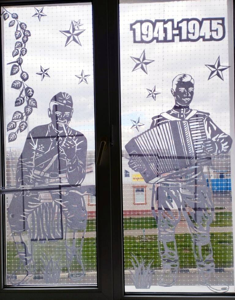 Сотрудники библиотеки творчески подошли к оформлению окон здания, создав на них тематические композиции, наполненные символами Победы. Среди украшений можно увидеть изображения детей в военной форме, гвоздики, Вечный огонь, голубей мира и, конечно же, всеми узнаваемую георгиевскую ленточку . Каждый элемент был выполнен с глубоким уважением и заботой.