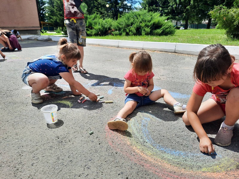 На время асфальт под ногами ребятишек превратился в холст, а фантазия не знала границ. Асфальт расцвел удивительными красками: желтое солнце засветило неровными лучами, и на лугу расцвел ковёр из разноцветных цветов, а в синее небо взлетели ракеты, чтобы исследовать необитаемые планеты.