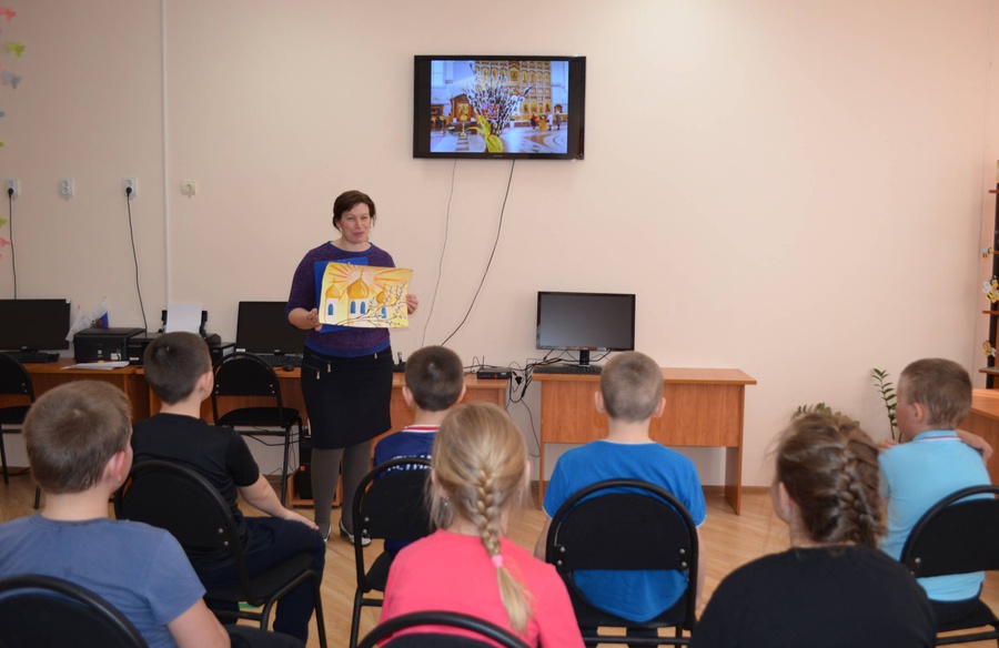 Ведущая рассказала детям сказку «Почему у вербы цветы пушистые», познакомила с русскими традициями, обрядами и обычаями. Мальчишки и девчонки узнали, что на Руси вербу использовали в качестве талисмана. Она была символом весны, приносящей с собой тепло.