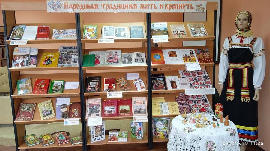2022 год объявлен президентом РФ Годом народного искусства и нематериального культурного наследия народов России. Народное искусство предоставляет человеку широкие возможности для творческой самореализации и приобщения к древним знаниям предков, играет важнейшую роль в жизни человеческого общества, так как помогает людям сохранить национальные и духовные ценности предков. Для того, чтобы лучше познакомиться с историей искусства народов России в отделе обслуживания Центральной библиотеки оформлена книжная выставка «Народным традициям жить и крепнуть». Выставка состоит из 6 разделов.