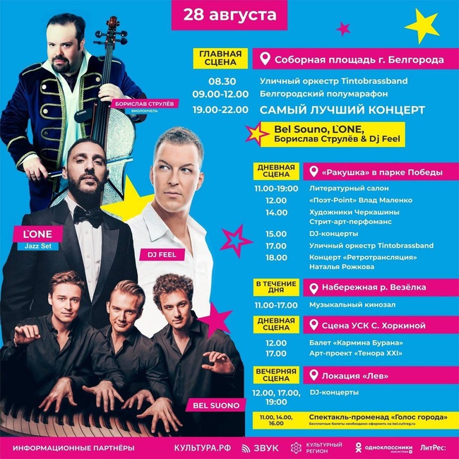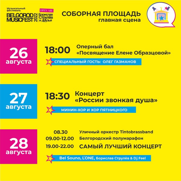 Он будет продолжаться три дня, с 26 по 28 августа. Фестиваль пройдет на пяти площадках: Соборная площадь, учебно-спортивный комплекс Хоркиной, опора ЛЭП в виде герба, сцена в парке Победы, набережная Везелки. За время фестиваля в Белгороде выступят более 500 артистов.