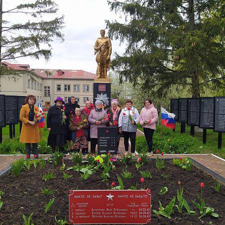 Пенсионеры возложили цветы к Памятнику воинской славы, затем минутой молчания почтили погибших в войне и умерших ветеранов.