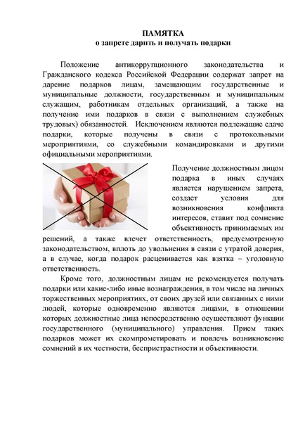 ПАМЯТКА о запрете дарить и получать подарки
