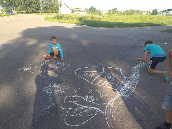 В распоряжении юных художников была целая территория, на которой дети смогли реализовать творческие фантазии, дав полную волю своему воображению. Рисунки были самые разные, но во всех присутствовала тема лета и хорошего настроения.