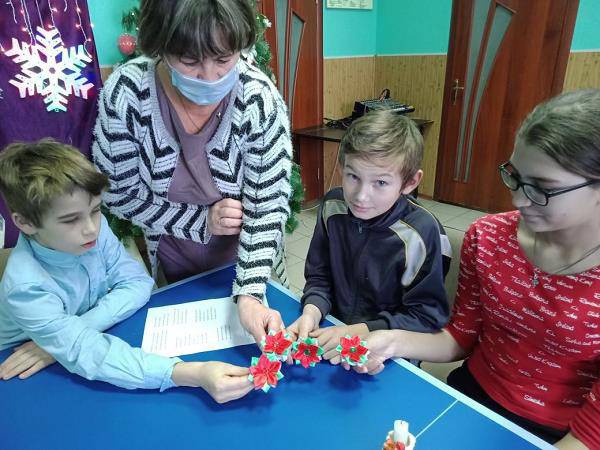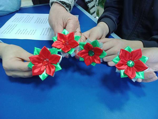 Обучение проведила мастер Елена Курочкина. Детям была представлена подробная пошаговая инструкция. Ребята за 30 минут смогли изготовить своими руками красивый цветок для украшения рождественской ели или сделать его замечательным подарком к празднику для своих близких.