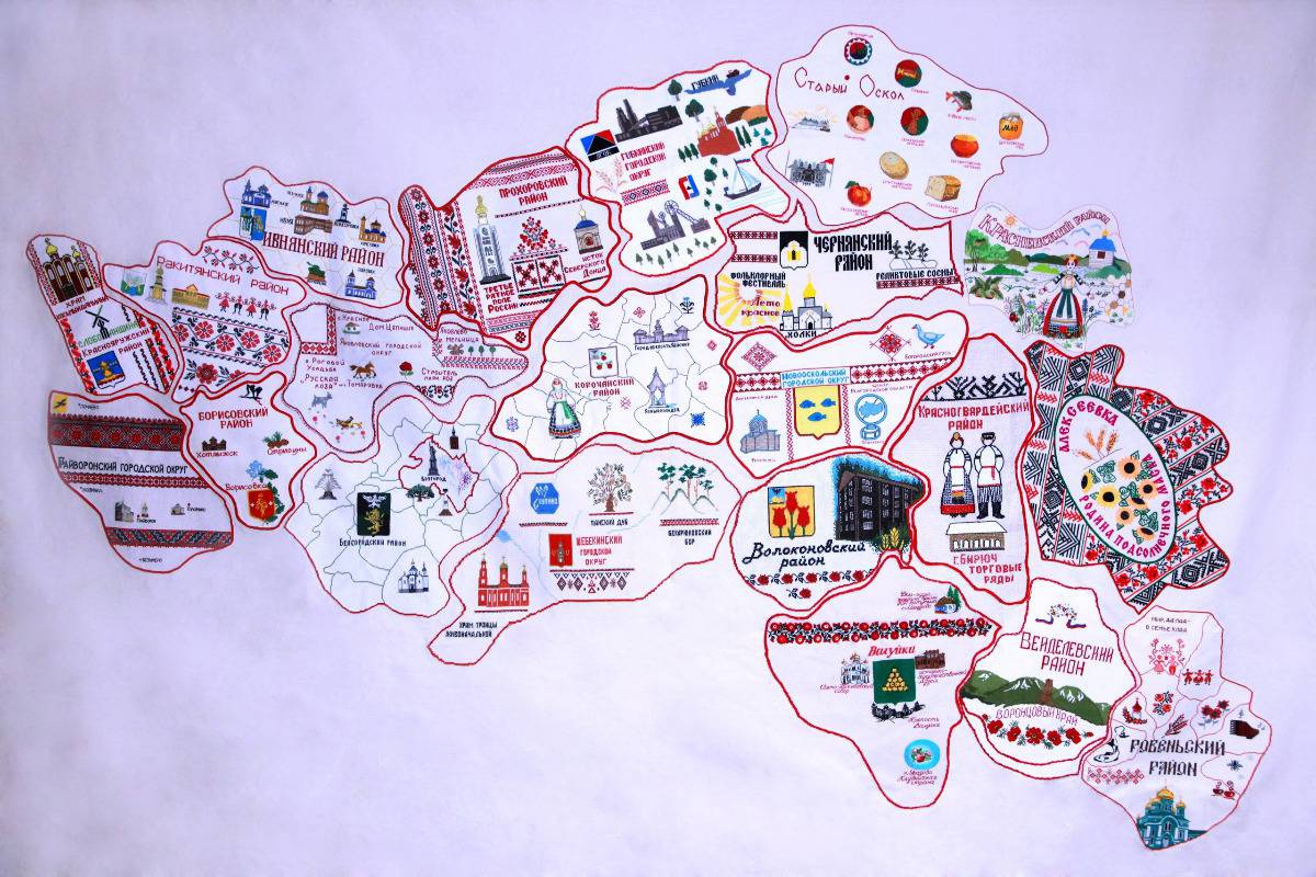 Над созданием карты Белгородской области трудились лучшие вышивальщицы со всего региона. На ней запечатлены традиционные орнаменты, бренды, знаменательные и исторические места всех территорий Белгородчины.