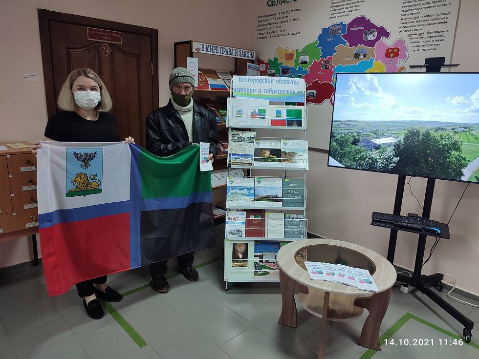 Для читателей библиотеки прошла акция с вручением информационных буклетов «Гордо реет Белгородский флаг», показом документальных фильмов регионального проекта "Места надо знать", а также знакомством с книгами, посвященных символике нашей области.