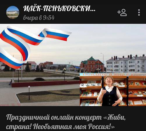 12 июня в социальных сетях Илёк-Пеньковского СДК состоялся праздничный онлайн концерт «Живи, страна! Необъятная моя Россия!», посвящённый Дню России.