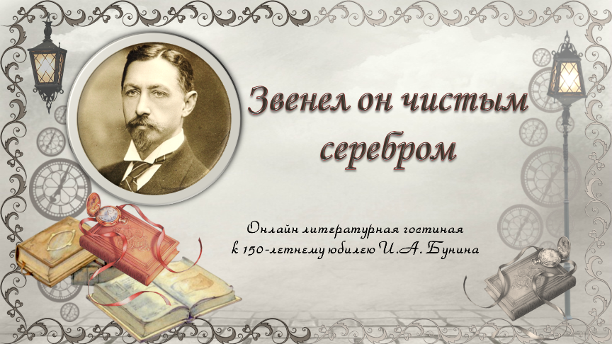 22 октября прошла онлайн литературная гостиная «Звенел он чистым серебром», посвященная 150-летнему юбилею со дня рождения русского писателя, поэта и переводчика Ивана Алексеевича Бунина. Мероприятие было доступно всем желающим на нашей странице в «ВКонтакте». В ходе мероприятия сотрудники Центральной библиотеки познакомили зрителей с интересными фактами из жизни писателя, рассказали об отношении к его творчеству в разные годы, в разных странах. Также можно было услышать отрывки из произведений писателя и окунуться в мир того прекрасного времени, которое олицетворял Иван Алексеевич Бунин.